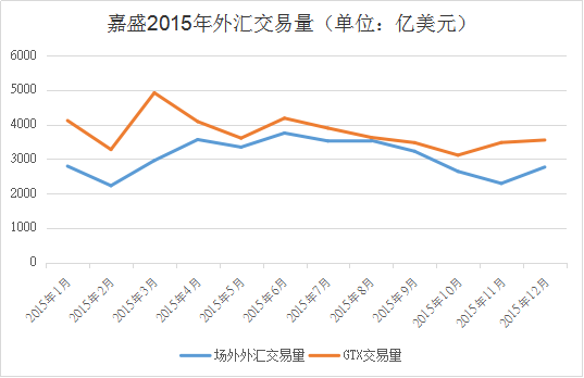 2015年嘉盛的外汇交易量跌宕起伏,机构外汇交易量与场外外汇交易量基本趋势相一致。上半年,外汇交易量在多起事件中大升大降,2月份机构、零售交易量急剧下跌,而3月份大幅上涨,6月份开始,嘉盛每月外汇交易量逐渐下跌,10月机构外汇交易量达到2015年最低水平,11月零售外汇交易达到年度第二低,随之,在年底,零售和机构外汇交易量情况有所缓和,小幅增长。