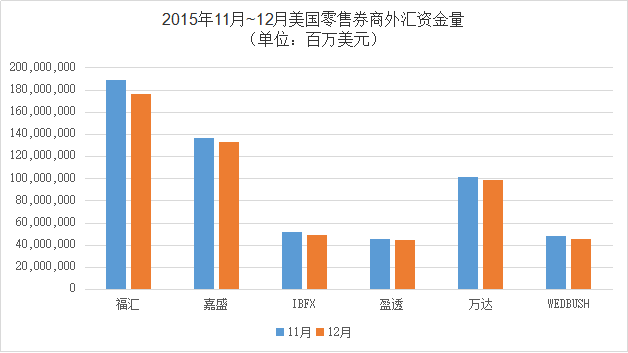 截至2015年12月底,美国零售外汇市场资金总量为544.1万亿美元,环比下跌4.7%。其中福汇和WEDBUSH12月资金量降幅最大,环比下跌幅度分别为6.7%和6.3%,IBFX、盈透、OANDA嘉盛降幅紧随其后。