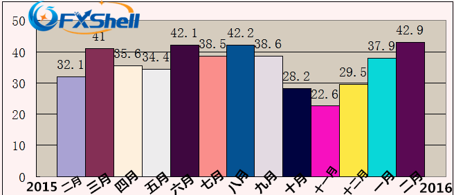 (图为MonexGroup2015年2月—2016年2月的每月外汇交易量情况,以十亿为单位)
