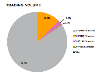 - 美元/卢布货币对2月份的外汇交易量为25.8万亿卢布,比一月份增长10.2%。依然是最受欢迎的货币对,且占总货币交易量的84.6%,比1月占得84.3%小幅增长。