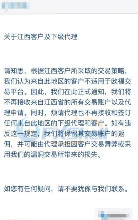 据欧福真实客户提供的参考消息,有一批江西的客户在欧福平台上主要做单一品种的交易,而且交易策略特别,与欧福交易平台的规定不符,所以欧福对是否接受这些用江西籍身份证开户的客户,做慎重考虑。■